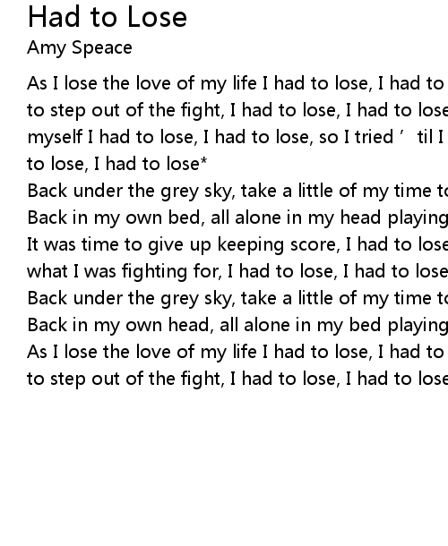 | As I lose the love of my life I had to lose, I had to lose, I wouldn' t choose to step out of the fight, I had to lose, I had to lose. Just to find a way to be myself I had to lose, I had to lose, so I tried ' til I had nothing left, I had to lose, I had to lose | |