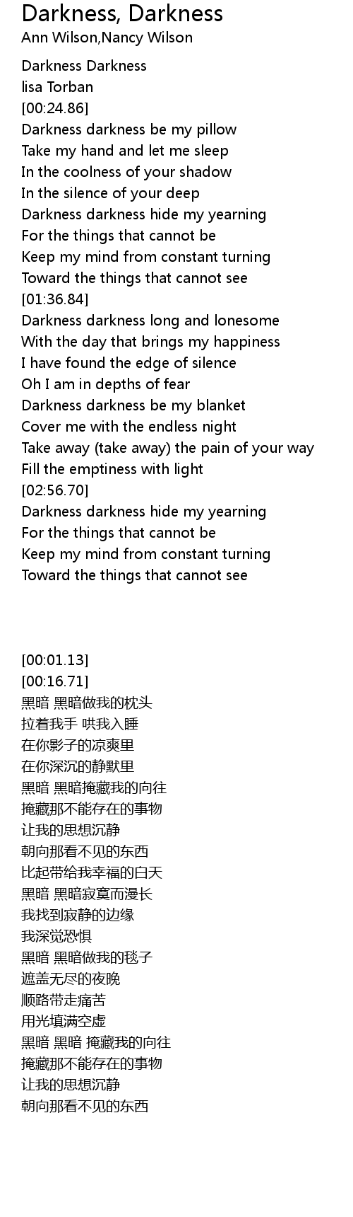 Darkness darkness long and lonesome |