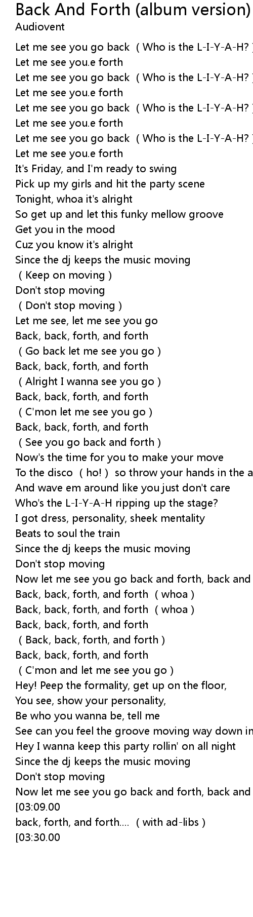 | [03:14.00][03:09.00][03:03.00][02:59.00][02:53.00][02:48.00][02:43.00][02:39.00] | Back, back, forth, and forth.... (with ad-libs) |