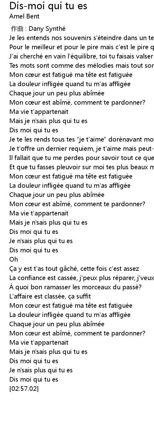 | [02:35.86] | Mais je n'sais plus qui tu es |