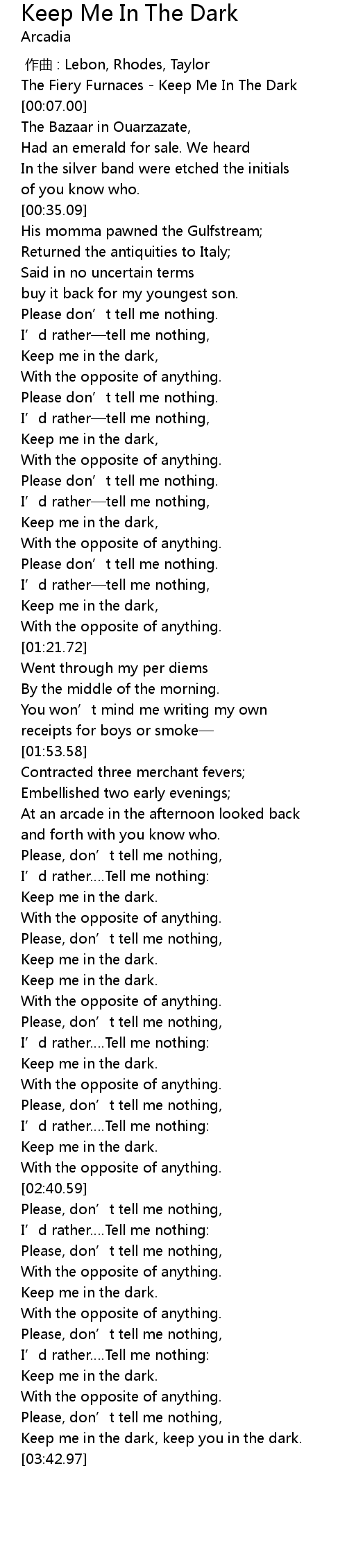 | [03:37.41] | Keep me in the dark, keep you in the dark. |