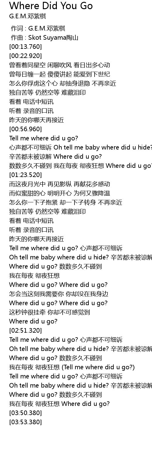 | [03:24.710] | Tell me where did u go? xīn shēng dōu bù kě xì sù |