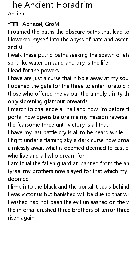 | I march to challenge all hell and now i'm before the last seal the red misty portal now opens before me my mission reverse what i've done and face the three the fearsome three until victory is all that | |