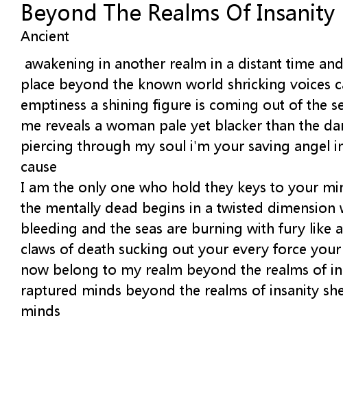 | I am the only one who hold they keys to your mind the journey to the realm of the mentally dead begins in a twisted dimension where the sky is forever bleeding and the seas are burning with fury like a dragons wrath you're in the claws of death sucking out your every force your heart and soul have died you now belong to my realm beyond the realms of insanity she rules the realm of the raptured minds beyond the realms of insanity she rules the realm of the raptured minds |