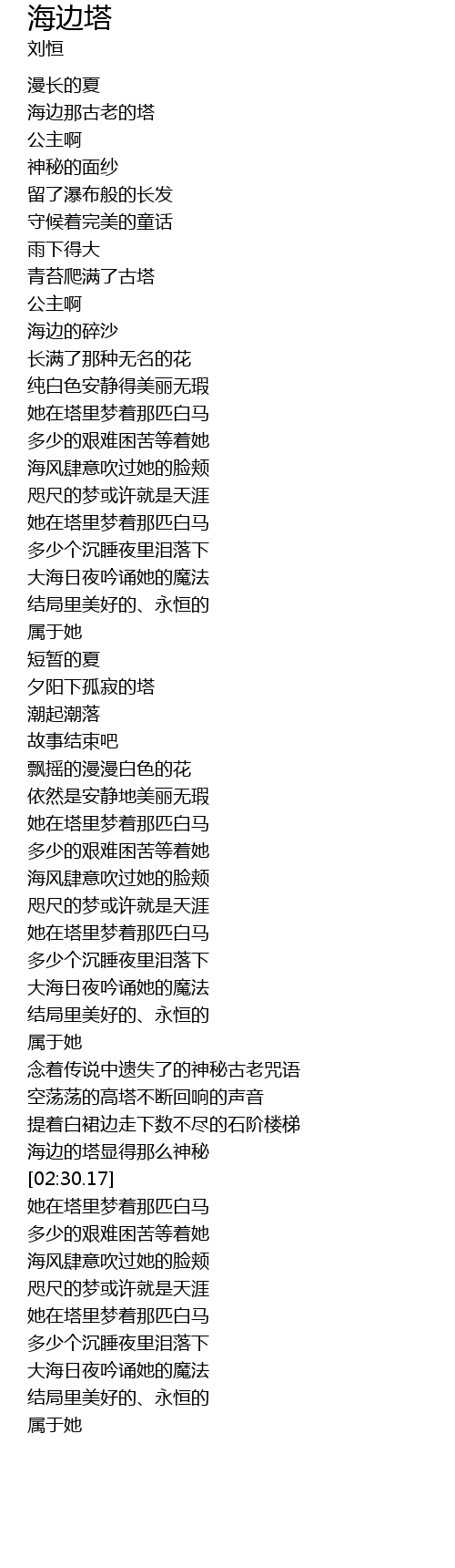 | [03:18.24] | 她在塔里梦着那匹白马 |