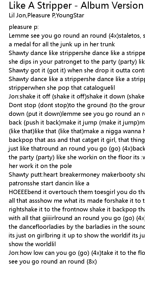 HOEEEbend it overtouch them toesgirl you do that like a proyou know you bad with all that assshow me what its made forshake it to the leftshake it to the rightshake it to the frontnow shake it backpop that backtwist the capwhat you do with all that giiiirlround an round you go (go) (4x){chorus}pleasure p:ladies on the dancefloorladies by the barladies in the sound clubshake it like a starif its just on girlbring it up to show the worldif its just on girlbring it up to show the worldlil |