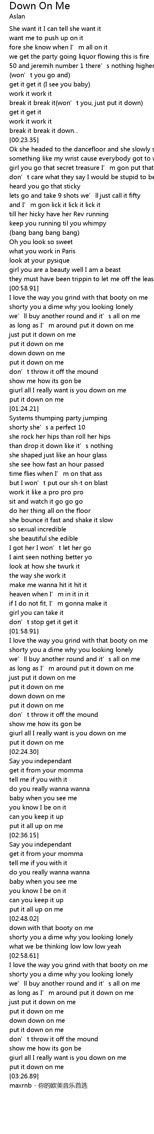 | [03:15.65] | put it down on me |