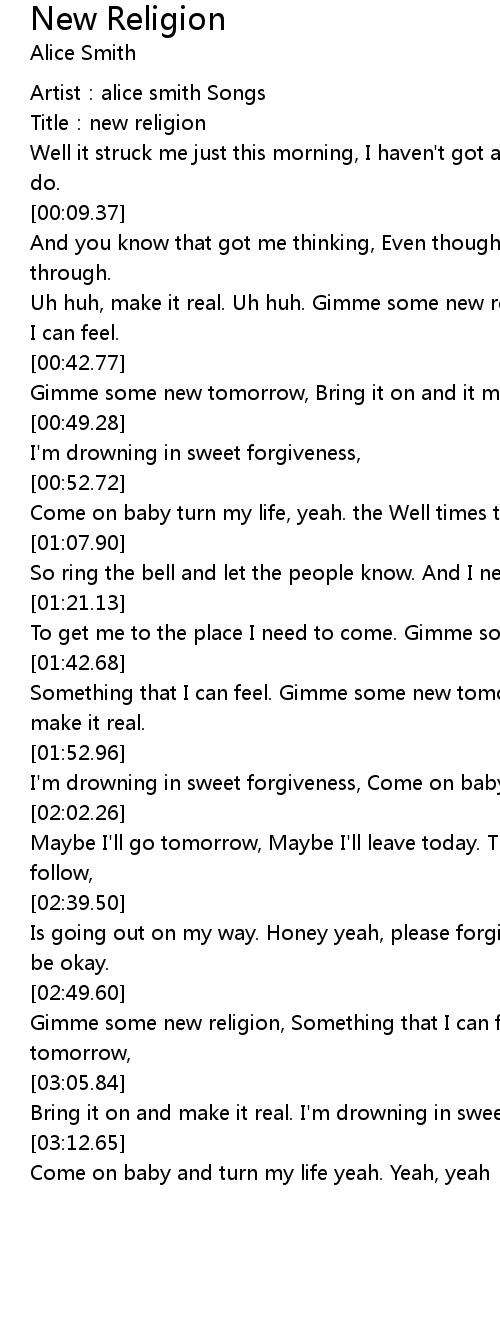 | [01:22.63] | To get me to the place I need to come. Gimme some new religion, |
