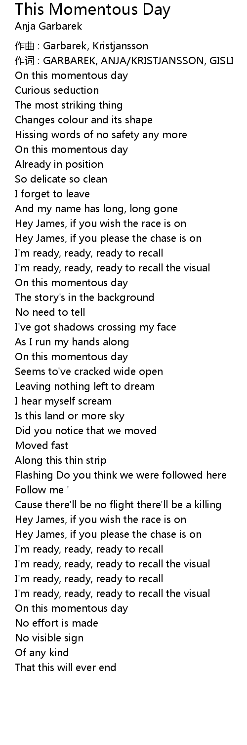 | 作词 : GARBAREK, ANJA/KRISTJANSSON, GISLI | |