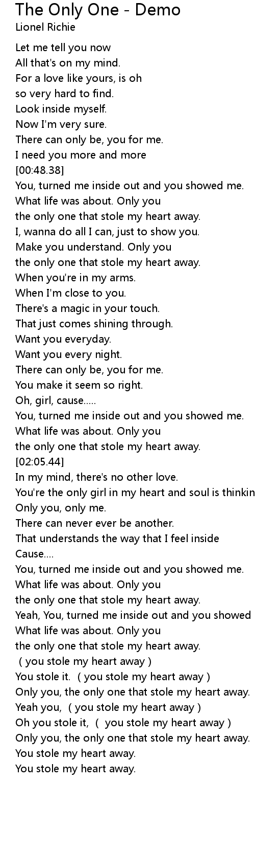 | [03:58.94] | Only you, the only one that stole my heart away. |