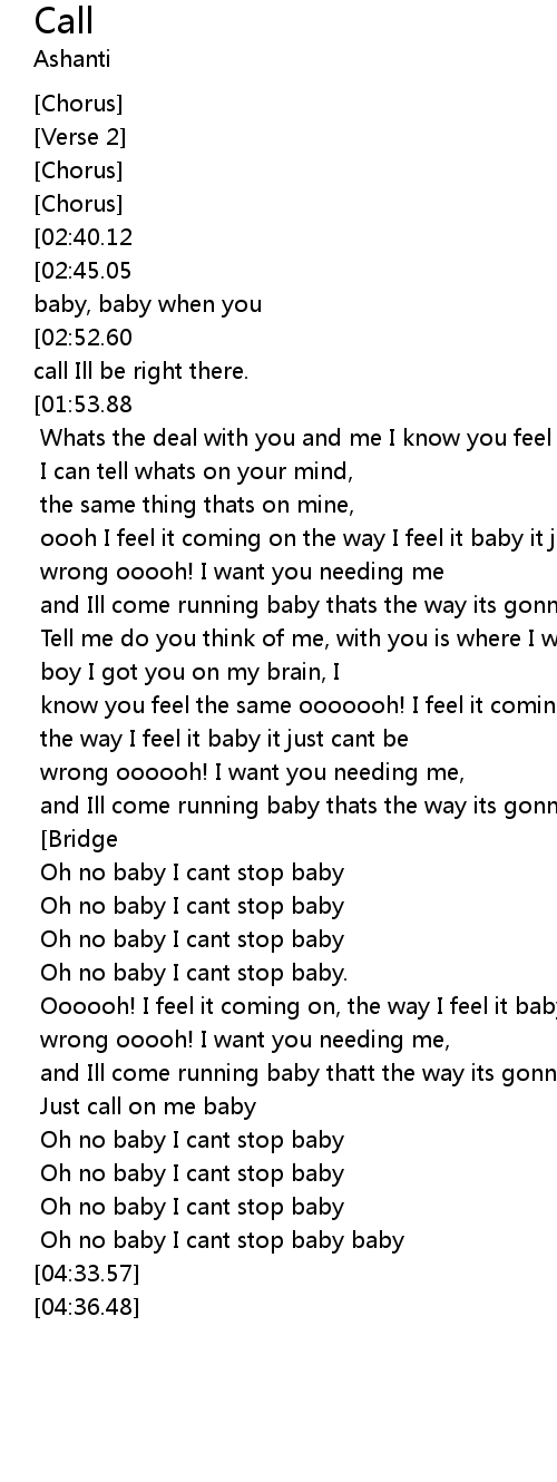 | [03:52.94][02:45.05][01:37.52][00:29.31] | baby when you call Ill be right there baby, baby when you |