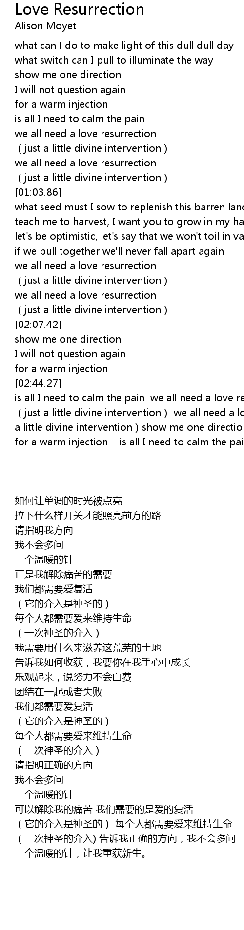 | [02:44.86] | is all I need to calm the pain we all need a love resurrection (just a little divine intervention) we all need a love resurrection (just a little divine intervention)show me one direction I will not question again for a warm injection is all I need to calm the pain |