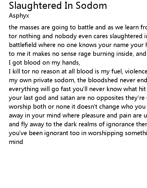 I kill tor no reason at all blood is my fuel, violence an urge and not a goal in my own private sodom, the bloodshed never ends two minutes to midnight, everything will go fast you'll never know what hit you, but this breath will be your last god and satan are no opposites they're one inside your mind you can worship both or none it doesn't change who you are because sodom is a place far away in your mind where pleasure and pain are united sodom is here take my hand and fly away to the dark realms of ignorance there's no way you can deny that you've been ignorant too in worshipping something that only exists in your own mind |