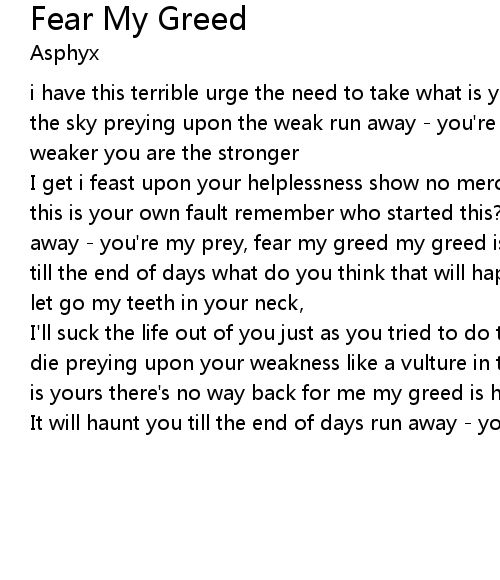 | I get i feast upon your helplessness show no mercy and have compassion because this is your own fault remember who started this? don't be afraid to die run away - you're my prey, fear my greed my greed is here to stay it will haunt you till the end of days what do you think that will happen now don't expect me to let go my teeth in your neck, | |