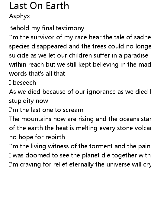I'm the survivor of my race hear the tale of sadness and genocide where the species disappeared and the trees could no longer breathe a drama of collective suicide as we let our children suffer in a paradise long gone utopia has never within reach but we still kept believing in the madness and the lies read my words that's all that |