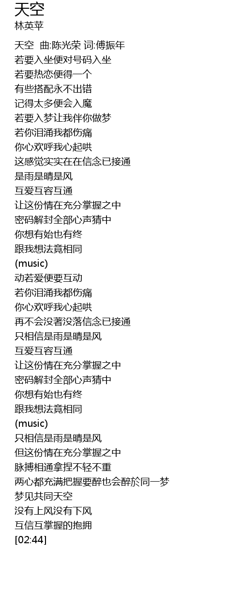 | [00:00] | 天空 曲:陈光荣 词:傅振年 |