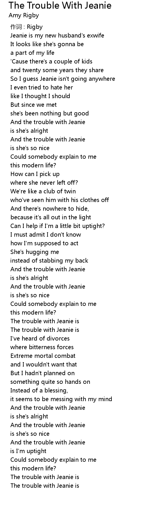 | [00:09.036] | Jeanie is my new husband's exwife |