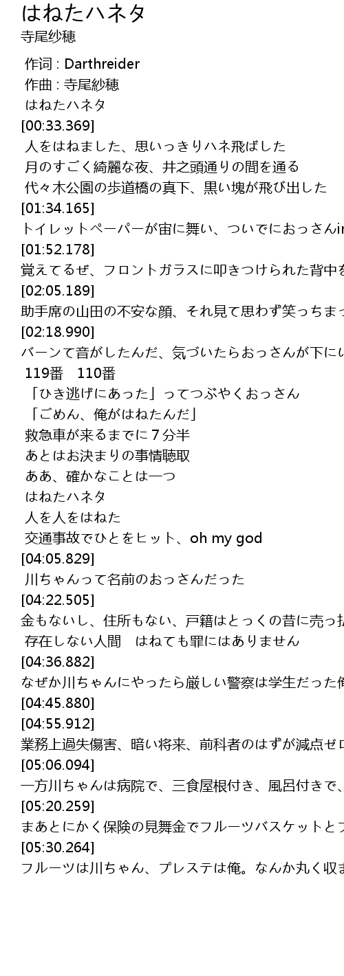| [04:55.912] | 業務上過失傷害、暗い将来、前科者のはずが減点ゼロ、優良ドライバーだってよ、変なの |