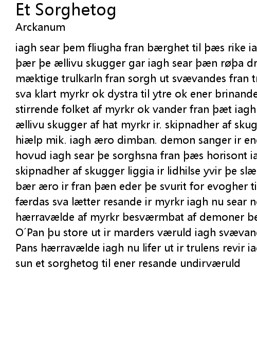 | iagh sear þem fliugha fran bærghet til þæs rike iagh sear þæn vægher þær þe ællivu skugger gar iagh sear þæn røþa drakin resa iagh æro þæn mæktige trulkarln fran sorgh ut svævandes fran træedhen ut ir smog þem star sva klart myrkr ok dystra til ytre ok ener brinande sial in ir þe sorghsna ok stirrende folket af myrkr ok vander fran þæt iagh sear ok kænner fran þe ællivu skugger af hat myrkr ir. skipnadher af skugger hvilar yvir. smerte hiælp mik. iagh æro dimban. demon sanger ir ener ende kakafoni gnolande ir mit hovud iagh sear þe sorghsna fran þæs horisont iagh sear þe myrkr ir skipnadher af skugger liggia ir lidhilse yvir þe slækte af sorgh sorghen þe bær æro ir fran þæn eder þe svurit for evogher til þæs rike iagh nu færdas sva lætter resande ir myrkr iagh nu sear nokot sva trulskt et hærravælde af myrkr besværmbat af demoner behærskat af var myrke. | |