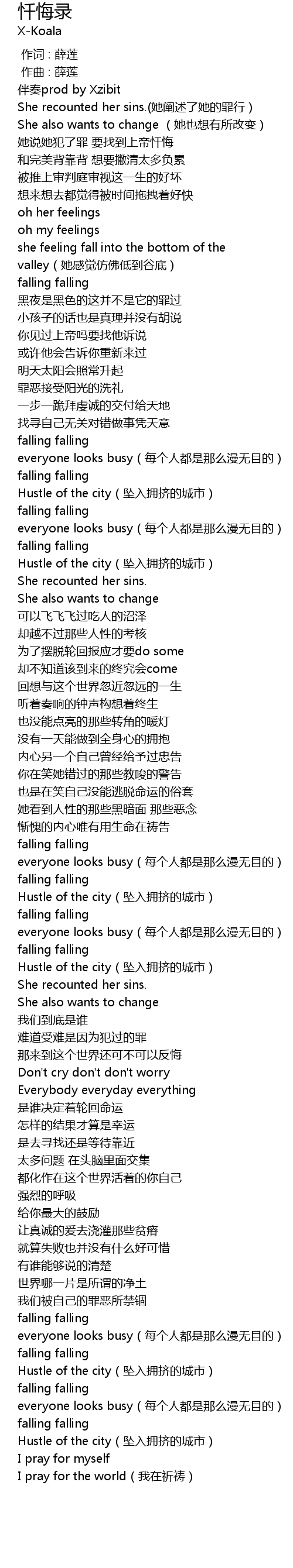| [00:16.199] | She recounted her sins. ta chan shu le ta de zui xing |