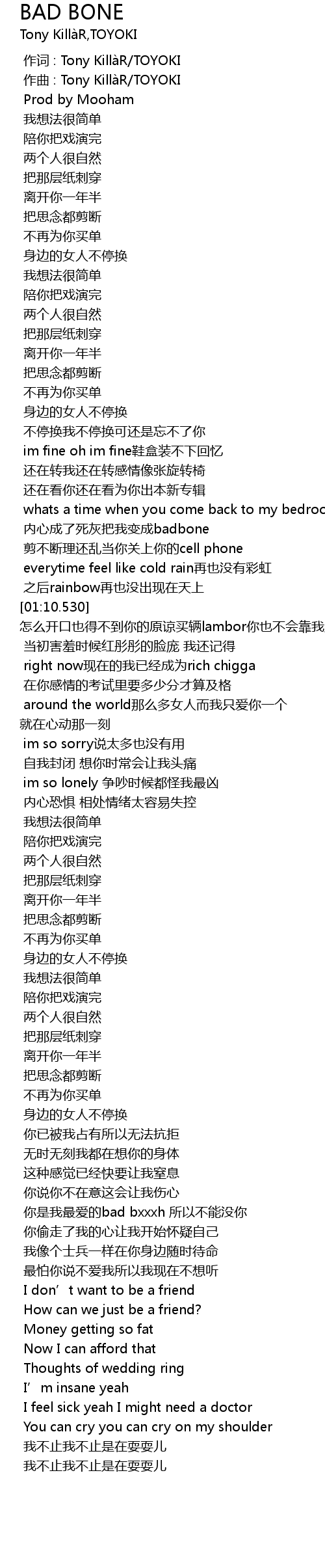 | [00:58.545] | 内心成了死灰把我变成badbone |