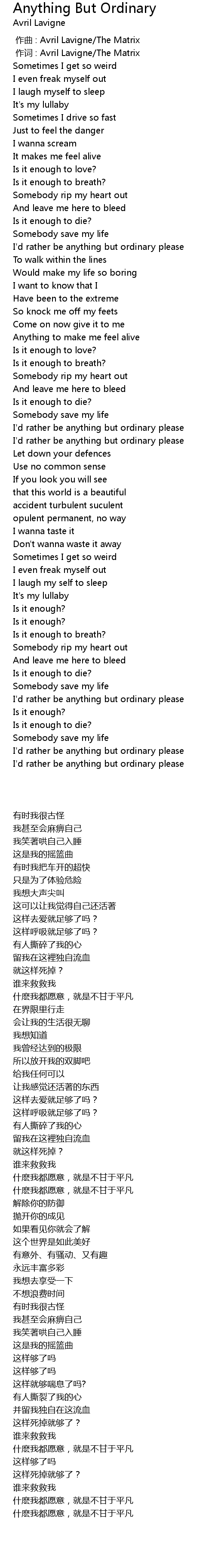 | [00:01.00] | 作词 : Avril Lavigne/The Matrix |