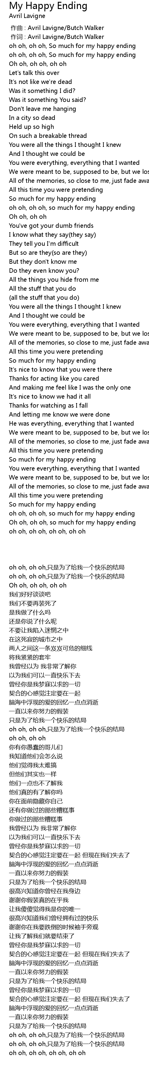 | [00:00.900] | oh oh, oh oh, So much for my happy ending |