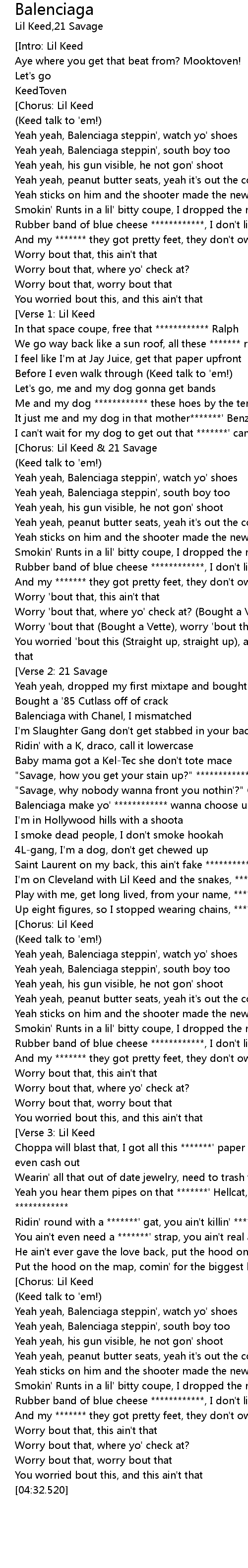 | [02:28.841] | Balenciaga make yo' ************ wanna choose up |