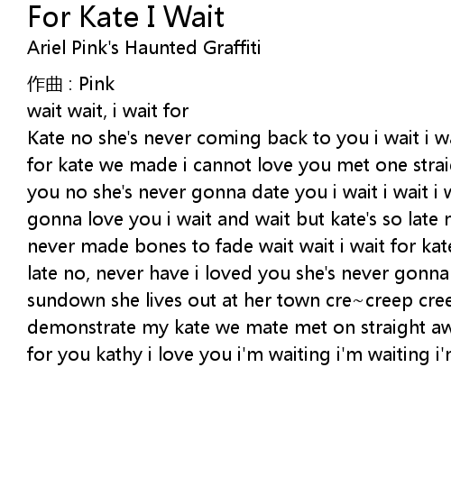 | Kate no she's never coming back to you i wait i wait for kate i wait demonstrate for kate we made i cannot love you met one straight await the take no i'm a need you no she's never gonna date you i wait i wait i wait for kate no she's never gonna love you i wait and wait but kate's so late no, no pda, the day today i never made bones to fade wait wait i wait for kate i wait i wait but kate's so late no, never have i loved you she's never gonna return to you gather at sundown she lives out at her town cre~creep creep creep for the first time demonstrate my kate we mate met on straight await the take kathy i'm waiting! for you kathy i love you i'm waiting i'm waiting i'm in love i love you |