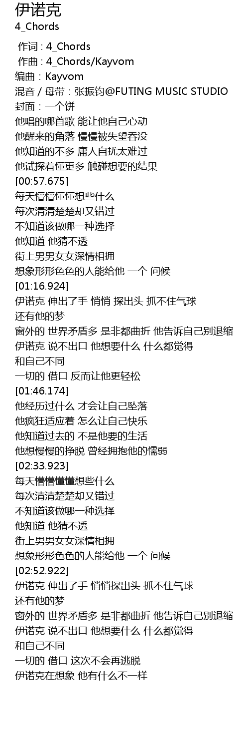| [03:01.162] | 伊诺克 伸出了手 悄悄探出头 抓不住气球 还有他的梦 |