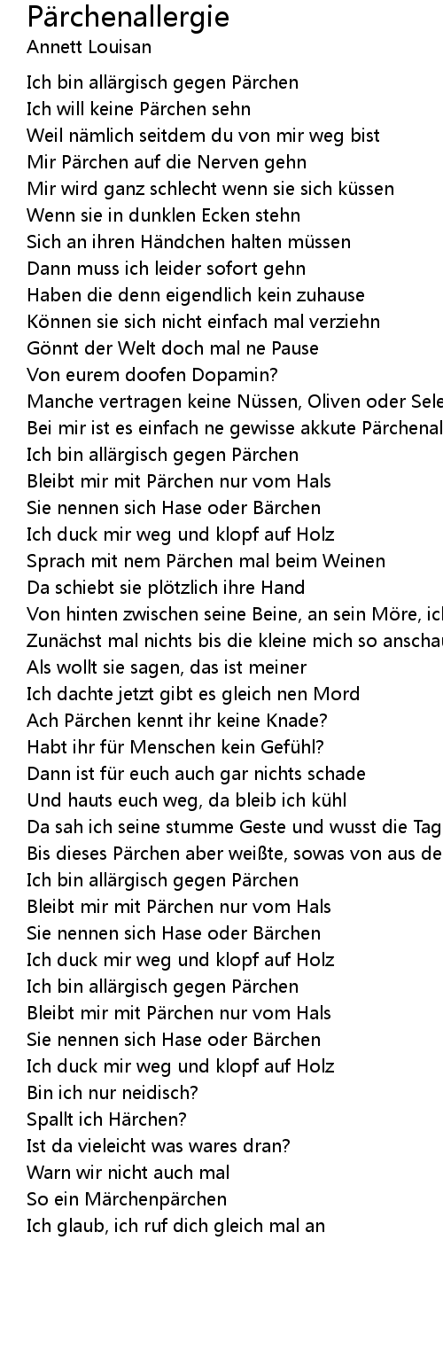 | Bleibt mir mit Pärchen nur vom Hals | |