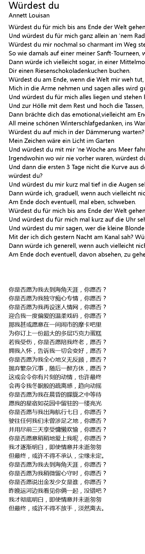 | [02:53.29] | Würdest du für mich bis ans Ende der Welt gehen, würdest du? |