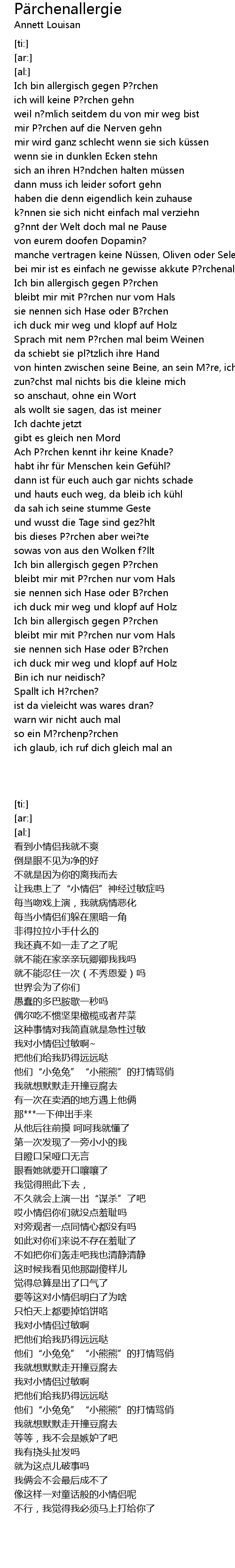 | [00:13.49] | Ich bin allergisch gegen P? rchen |