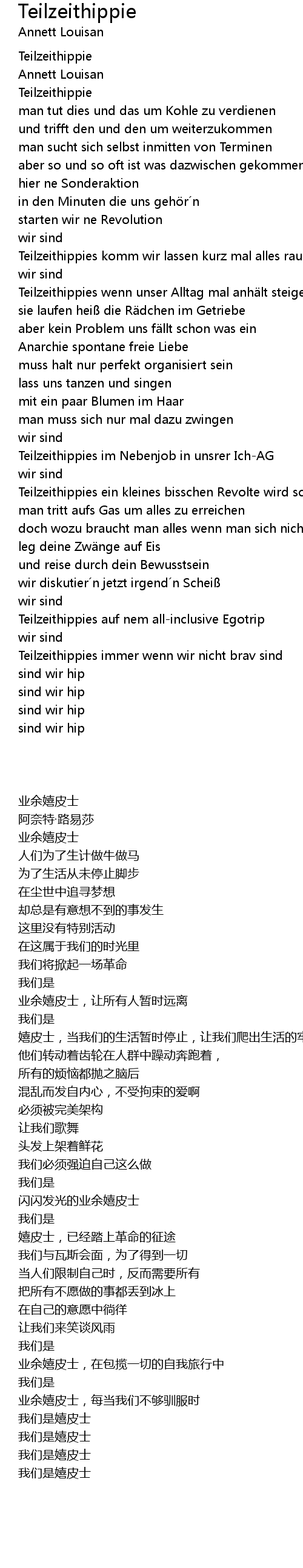| [00:46.08] | Teilzeithippies wenn unser Alltag mal anh lt steigen wir aus |