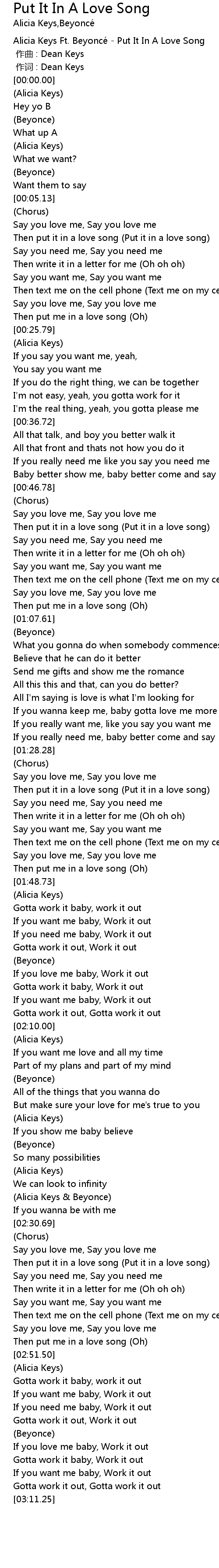 | [00:-7.52] | Alicia Keys Ft. Beyonce Put It In A Love Song |