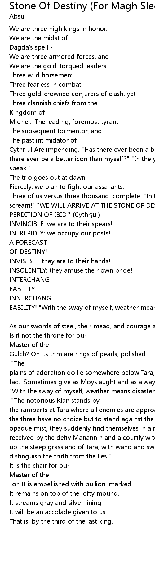 | Three of us versus three thousand: complete. " In the eyes of myself, I adroitly scream!" " WE WILL ARRIVE AT THE STONE OF DESTINY." Tara " WE WILL REACH THE PERDITION OF IBID." Cythr ul | |