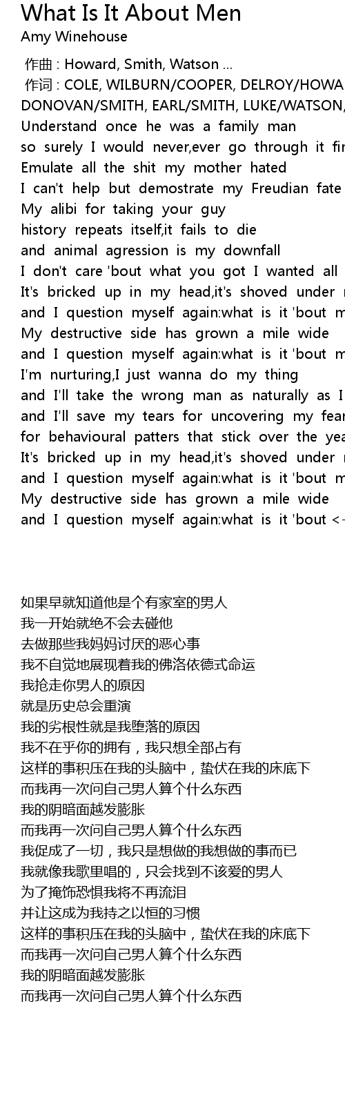 | [01:53.68] | and I question myself again: what is it ' bout men? |