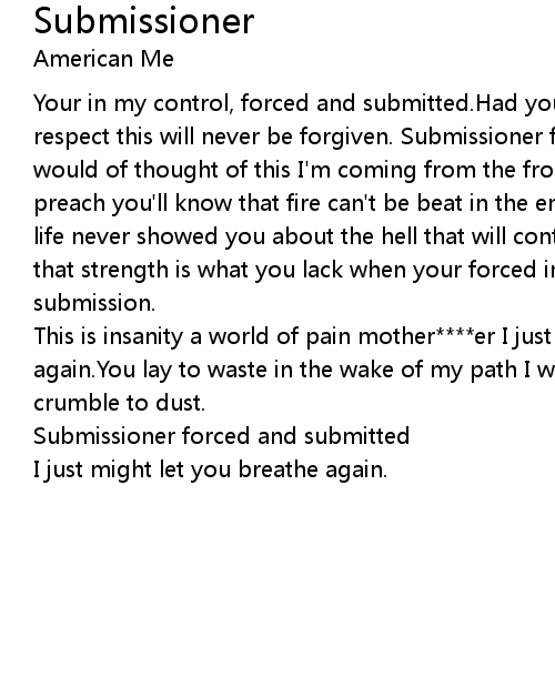 Your in my control, forced and submitted.Had you from the back you lost my respect this will never be forgiven. Submissioner forced and submitted you never would of thought of this I'm coming from the front and if you practice way you preach you'll know that fire can't be beat in the end.Not in the end. Your past life never showed you about the hell that will control you just face the fact that strength is what you lack when your forced into submission.Forced into submission. |