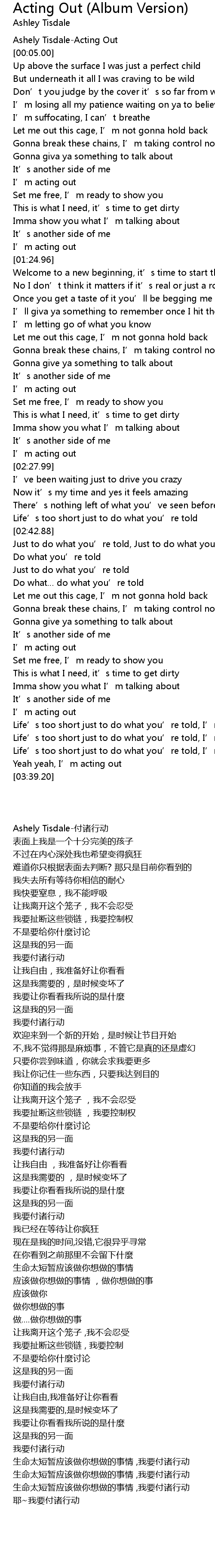 | [00:00.01] | Ashely TisdaleActing Out |