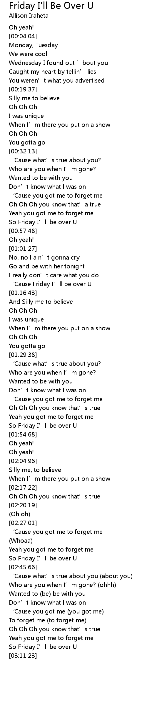 | [01:13.70] | ‘Cause Friday I’ll be over U |