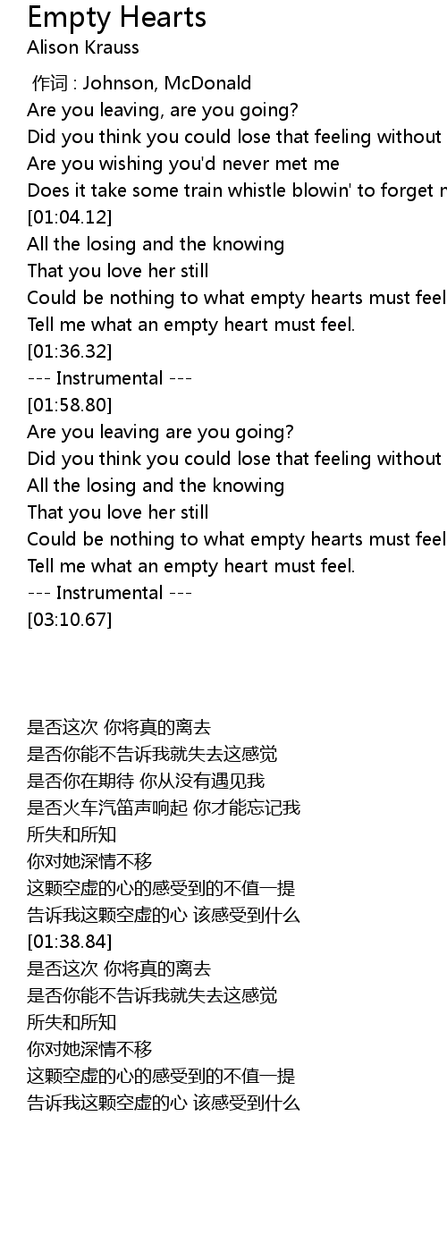| [01:30.76] | Tell me what an empty heart must feel. |