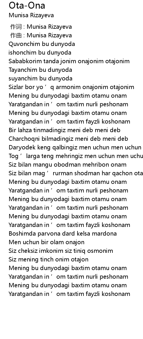 | [00:01.000] | zuò qǔ : Munisa Rizayeva |
