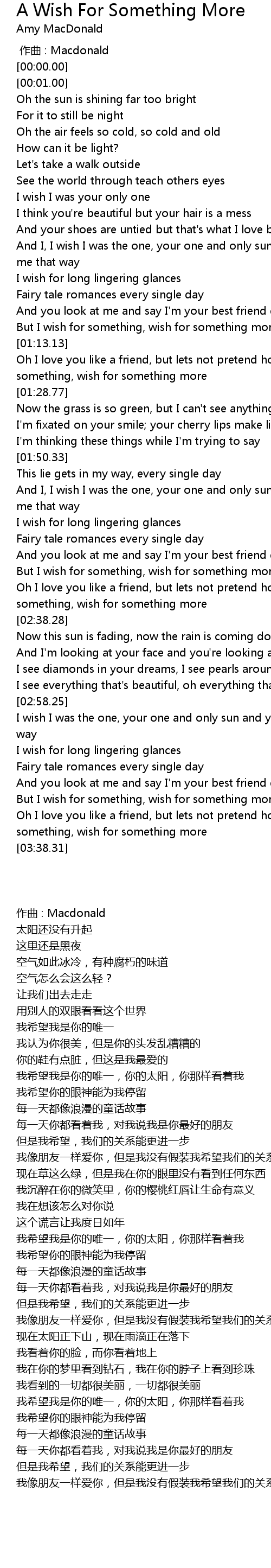 | [03:26.56] | Oh I love you like a friend, but lets not pretend how I wish for something, wish for something more |