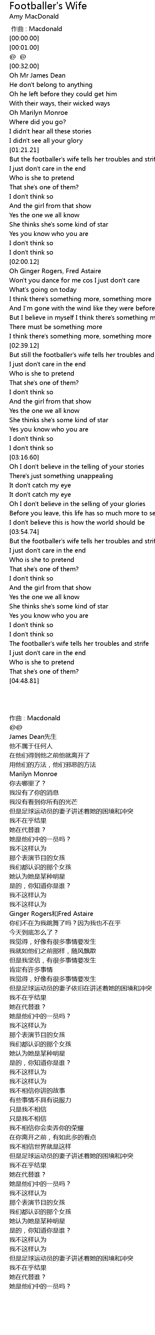 | [04:35.09] | The footballer' s wife tells her troubles and strife |
