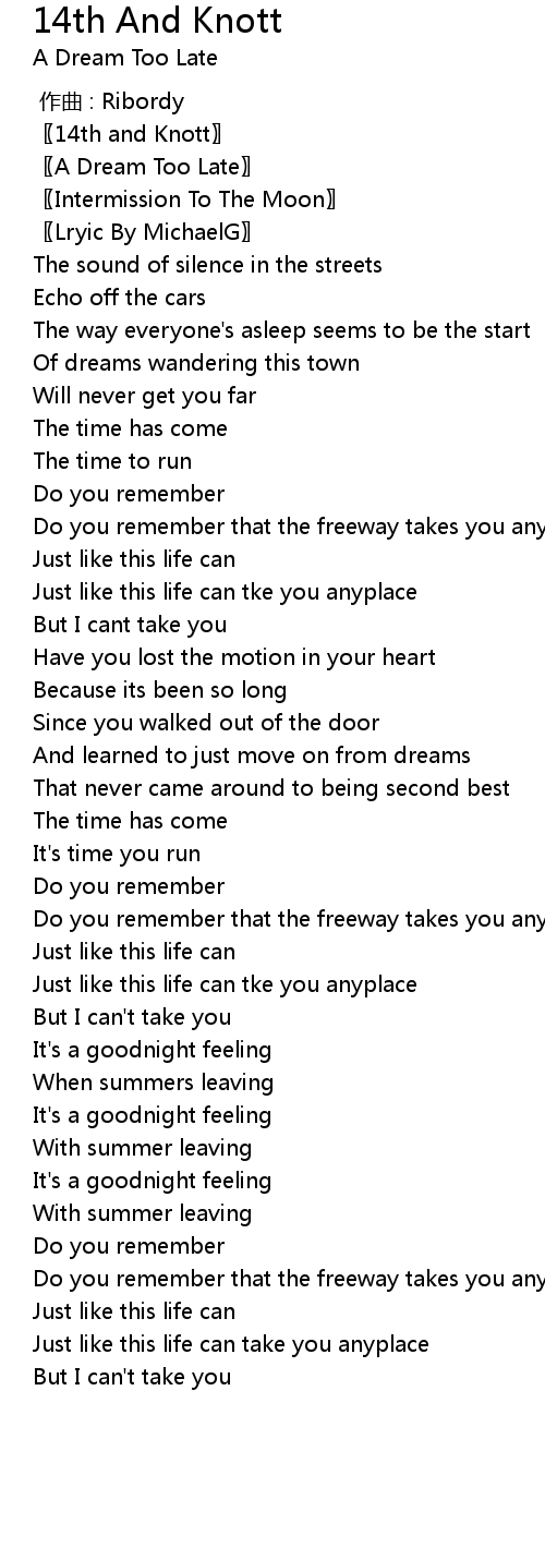 | [00:15.00] | 〖A Dream Too Late〗 |