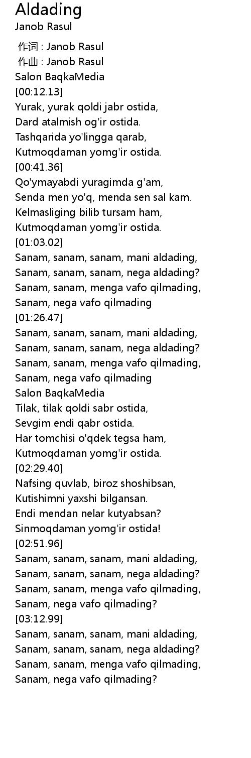 | [02:57.04] | Sanam, sanam, sanam, nega aldading? |