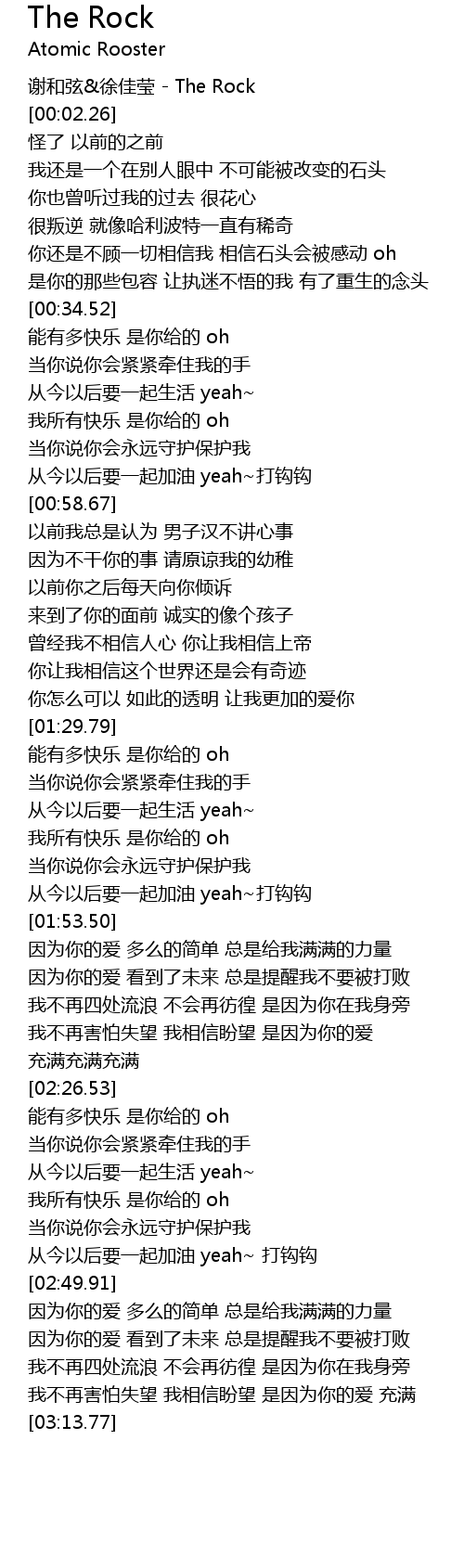 | [00:00.03] | 谢和弦&徐佳莹 - The Rock |