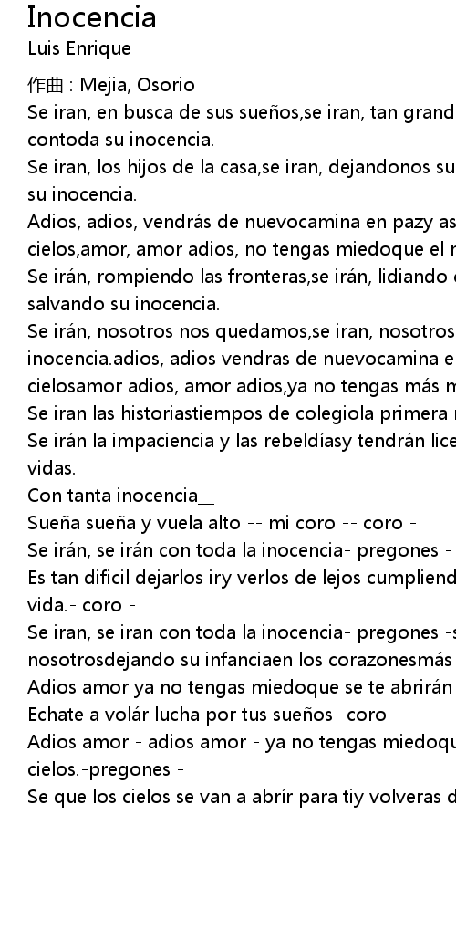 | Se iran, se iran con toda la inocencia pregones se iran igual que nosotrosdejando su infanciaen los corazonesmá s allá del alma. coro | |