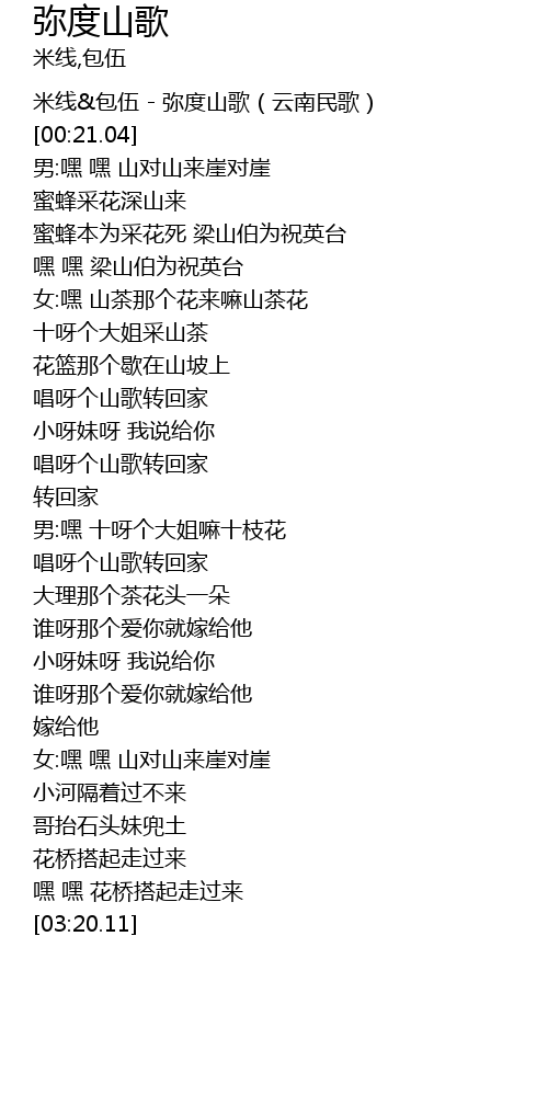 | [00:00.00] | 米线&包伍 - 弥度山歌(云南民歌) |