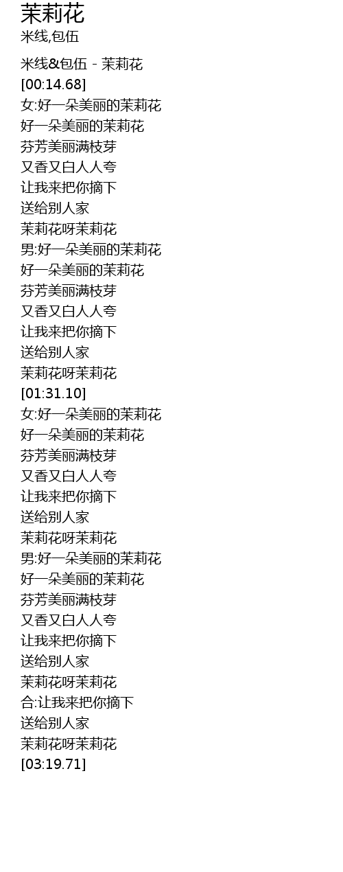 | [00:00.00] | 米线&包伍 - 茉莉花 |